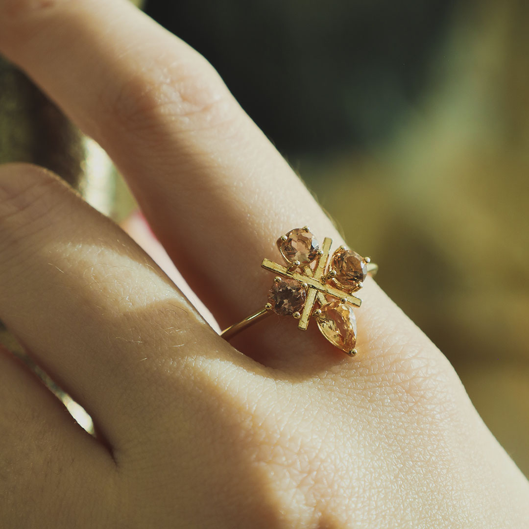 ANEL CRUZADO TOPAZIO IMPERIAL GOTA 6X4MM – 3 TOPAZIO IMPERIAL REDONDO DE 4.0MM – 3,5G OURO AMARELO 18K – TAMANHO 23