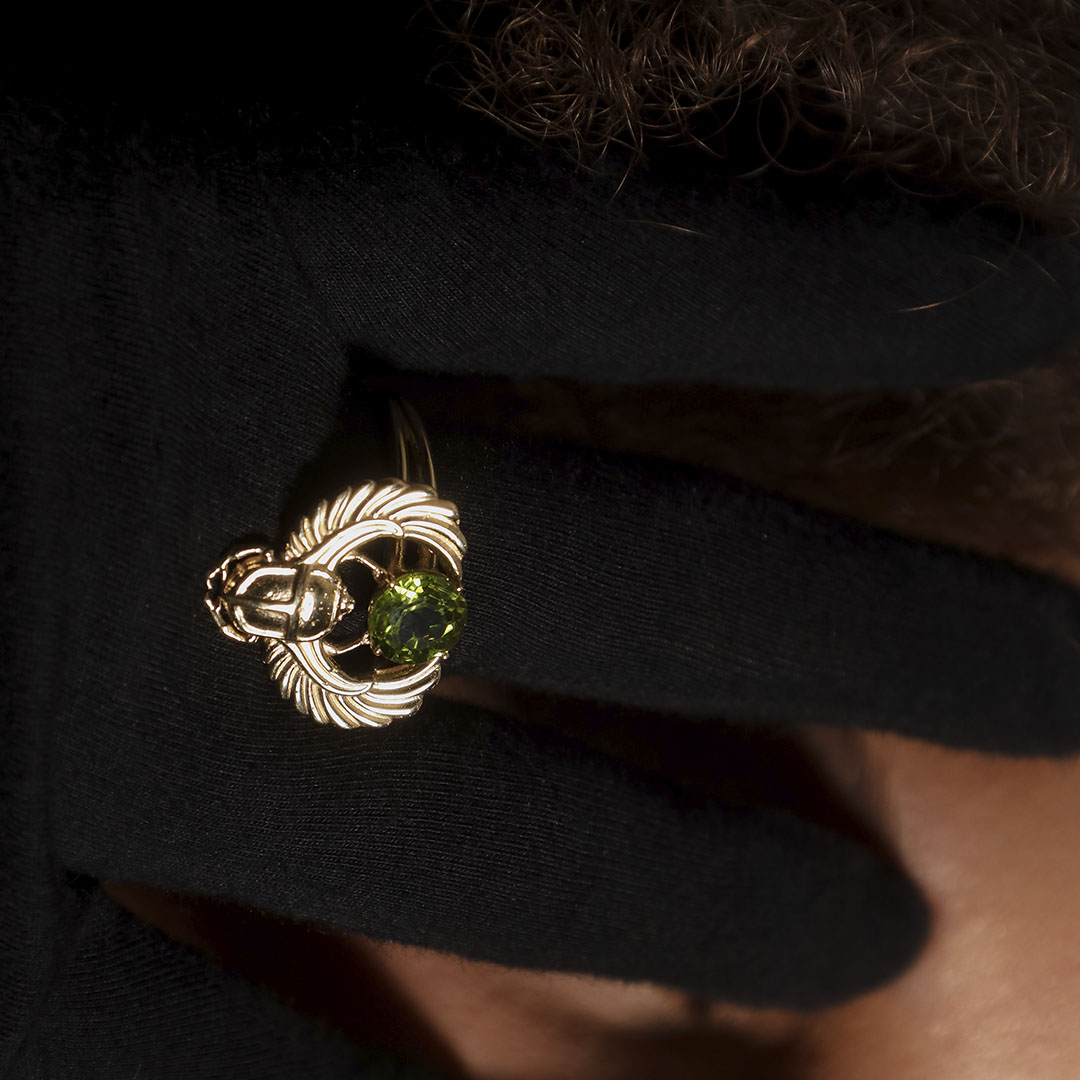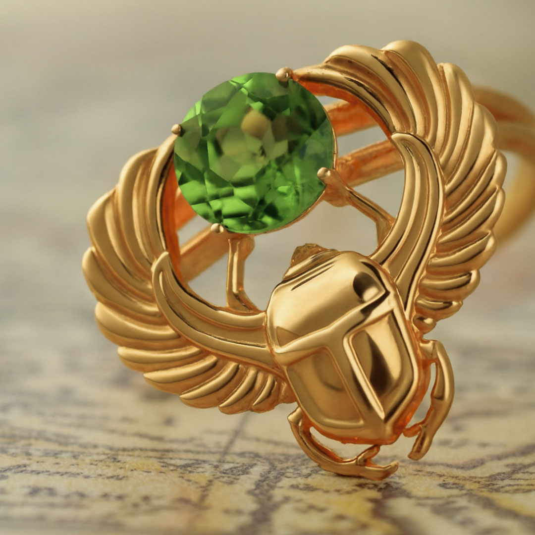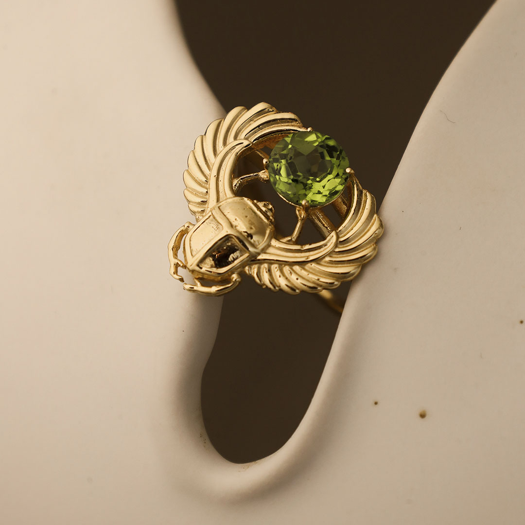 ANEL ESCARAVELHO CLEOPATRA – ANEL COM PERIDOTO REDONDO 8.0MM – 7,60G OURO AMARELO 18K – ARO TAMANHO 24